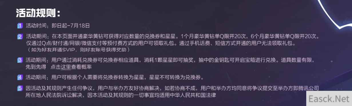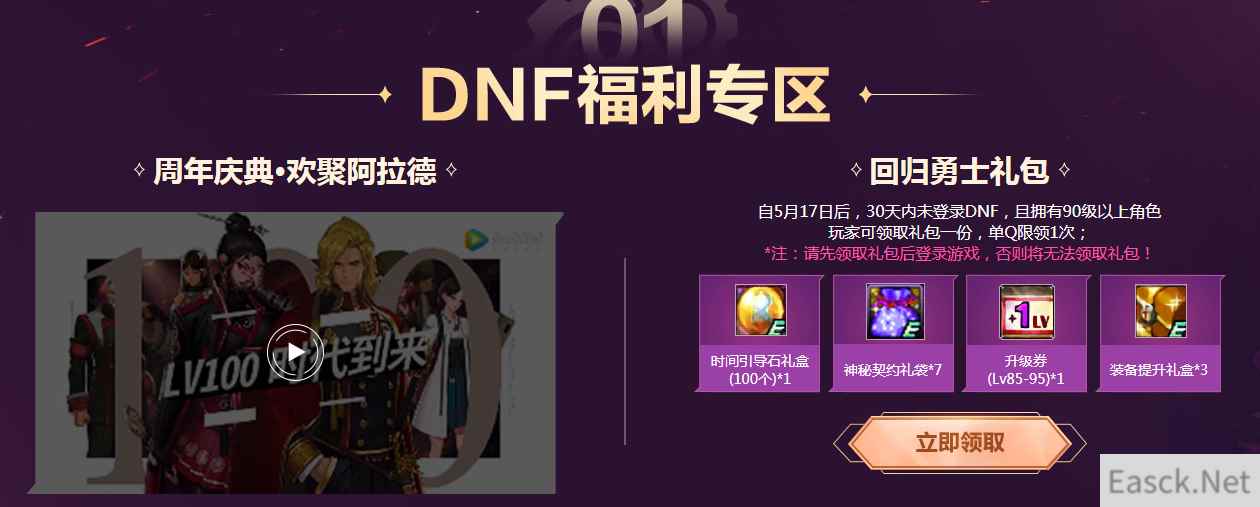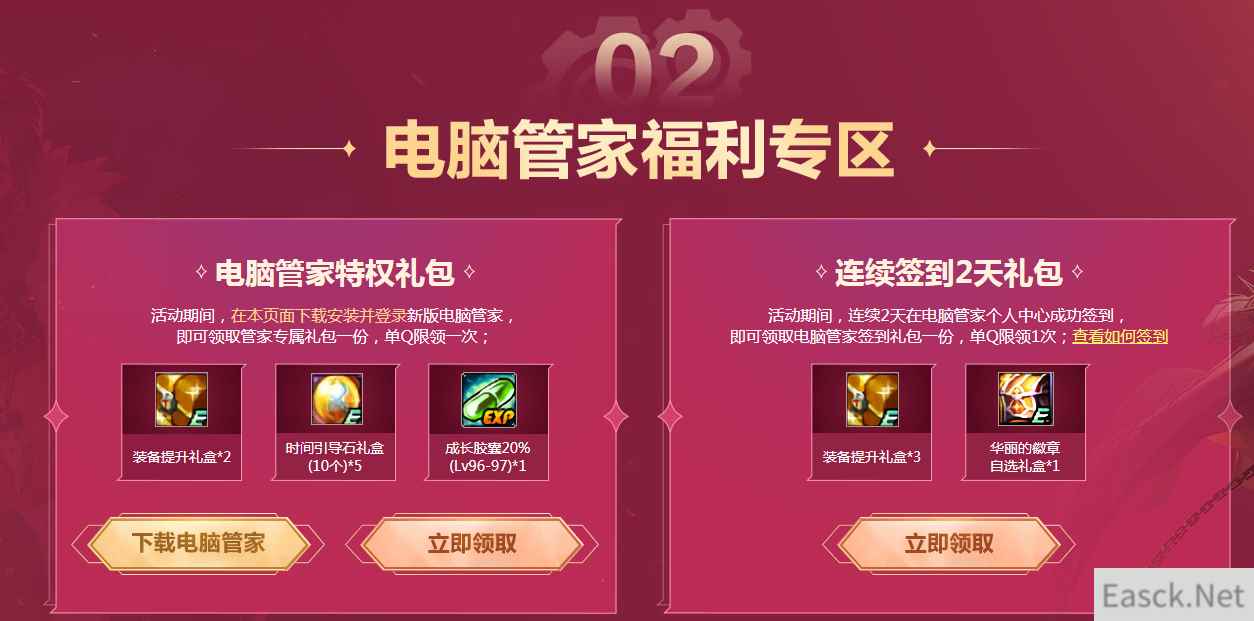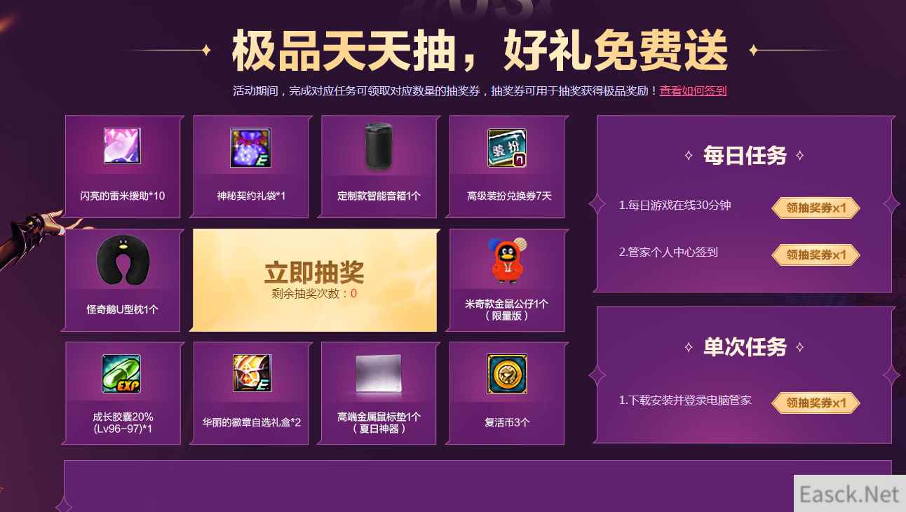 FAQ 1.为什么不能领取勇士回归礼包? 2020年5月17日之后(包含当日)未登录过DNF,且页面绑定大区中拥有一个90级以上角色的玩家,才可领取回归礼包;单q限领一次 2.电脑管家连续签到2天礼包怎么领取? 需要在电脑管家个人中心,连续签到2天签到成功后,返回本页面领取; 3.抽奖次数每天是否清零? 抽奖次数活动结束前可累计,不清零: 4.抽奖抽到虚拟道具什么时候发货? 虚拟道具将于24小时之内发货至《地下城与勇士》绑定角色的邮箱内:游戏内邮箱保留14个自然日,请及时登录游戏查收: 5.抽奖抽到实物道具什么时候发货? 实物奖励道具将于活动结束后15个工作日之内发放,请注意查收; 活动规则 ·活动时间:2020年6月18日至2020年7月18日; ·本规则仅适用于通过本页面参与活动的用户; ·页面上的活动礼包请用户根据相应规则确认领取资格后领取; ·页面涉及的游戏道具奖励将通过《地下城与勇士》游戏内邮箱发放至用户本页面绑定领奖的角色;游戏内邮箱领取时限为14个自然日,自用户在页面点击领取奖励开始计算(请注意在邮件时效内登录游戏领取); ·用户如果使用任何不正当方式参与此活动,腾讯有权收回您非法获得的全部道具,并就相关行为予以处罚; ·若您无法领取电脑管家礼包或资格,请确认当前电脑管家版本是否过低,建议在本页面下载安装新版本后尝试领取; ·抽奖概率公示;查看详情 ·电脑管家保留在法律规定的范围内对上述规则进行解释的权利