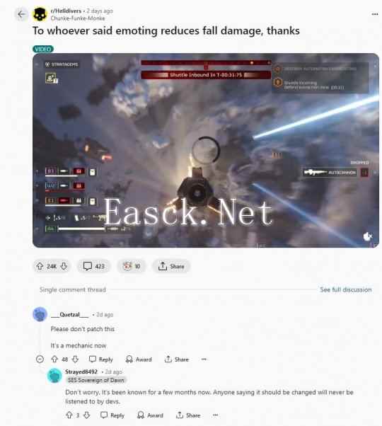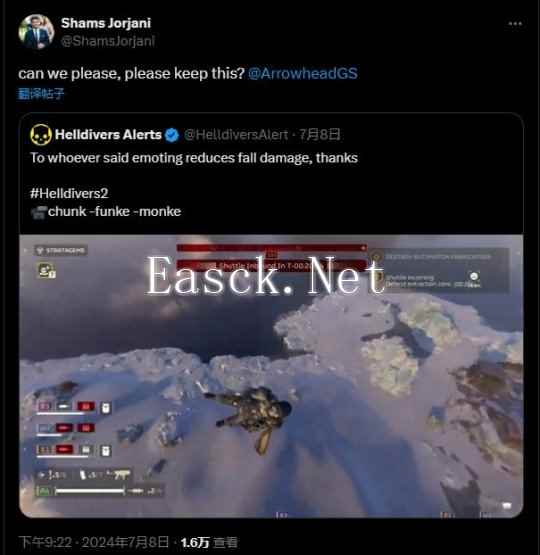 《绝地潜兵2》玩家发现使用表情可减免坠落伤害 请求官方不要修复