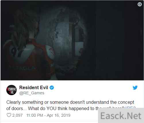 4月16日官方推特又发布了一张图片,而图片上显示着被打破的墙壁。由于《生化危机2》故事发生在《生化危机3》之后,所以里昂和克莱尔很有可能看到的是被Nemesis侵袭之后留下的一片狼藉的景象。以此看来,卡普空似乎又在暗示着《生化危机3》的相关内容。