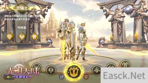全新选角页面 帅气突破天际 在《光明大陆》全新的选角页面中,场景精致度全面得到提升,环形地板上浮现光耀四射的职业标志,中景四座宏伟的石像手持大剑,透出凛凛威仪,远景中更有巍峨的堡垒矗立在缥缈云间,在骄阳与月光下,依据职业的不同,闪耀出各异的背景色彩。