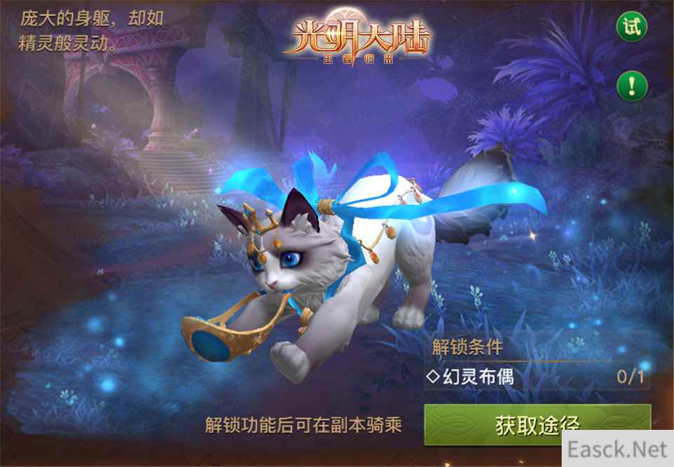 可爱的外表,是熔岩幼龙最显著的特征,从头到脚都胖乎乎的,让人忍不住想捏一捏。尽管张开嘴巴露出了锋利的龙齿,但头上的创口贴令它怎么看都像输了游戏后赖皮的小不点。 来自熔岩一族的血脉,使熔岩幼龙对各类道具有着深刻的认知。使用道具后可以解锁随身鉴定/打造装备的功能。 坐骑再升级,副本任驰骋 随着对坐骑研究的不断深入,凯伦城发现了赋予坐骑副本骑乘功能的方法,进一步增强了坐骑的实用性。本周,星月交辉和幻境布偶两款坐骑完成功能研发,消耗星门之石即可解锁其副本骑乘功能。