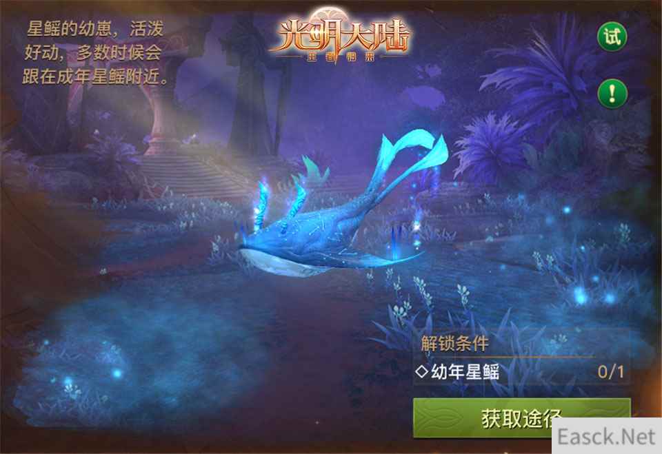 追随着虚空星鳐的步伐,幼年星鳐也降临玛瑟兰德大陆,它也拥有着唯美的外观和浮空的能力,消耗银币即可抽取,是你征战四方的绝佳坐骑!