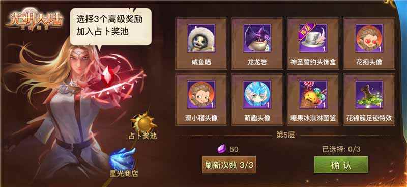 如今,命运星盘重磅亮相,肩负斩妖除魔重任的你获得了星盘的青睐,可以付出一定代价进行占卜。占卜前,玩家可以从8个高级奖励与更稀有的珍品奖励中选择3至5个加入星盘,与其他随机奖励一同占卜,在特定层数更必定会出现“幻灵布偶”、“星鳐”、“星月交辉”、“星空独角兽”、“荣耀独角兽”、“九尾狐”、“暗影独角兽”等珍品奖励,获得玩家所需奖励的概率大大提升!
