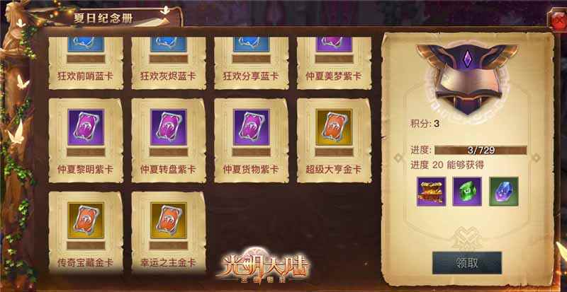 在对抗邪魔大军的战役中,除了奋战在前线的勇士们,从事科学研究的智者们也发挥了重大作用,他们研发新的套装,提取灵魂特质,开发强力伙伴,促进了大陆联军的战力提升。通过知识竞赛,或许你也有机会成为智者,与他们一起攀登智慧巅峰! 夏日欢愉,纪念点滴成果 炎热的气候倍增了勇士们征战的难度,对战绩的纪录和奖励正是激励他们的最佳手段,截止8月8日,玩家可在马肖安处领取《仲夏时光纪念册》,纪念册中有许多纪念卡,完成卡牌对应的任务即可获得该纪念卡,获得对应奖励和积分。积分累积达到对应的进度时,还可解锁更珍贵的奖励!