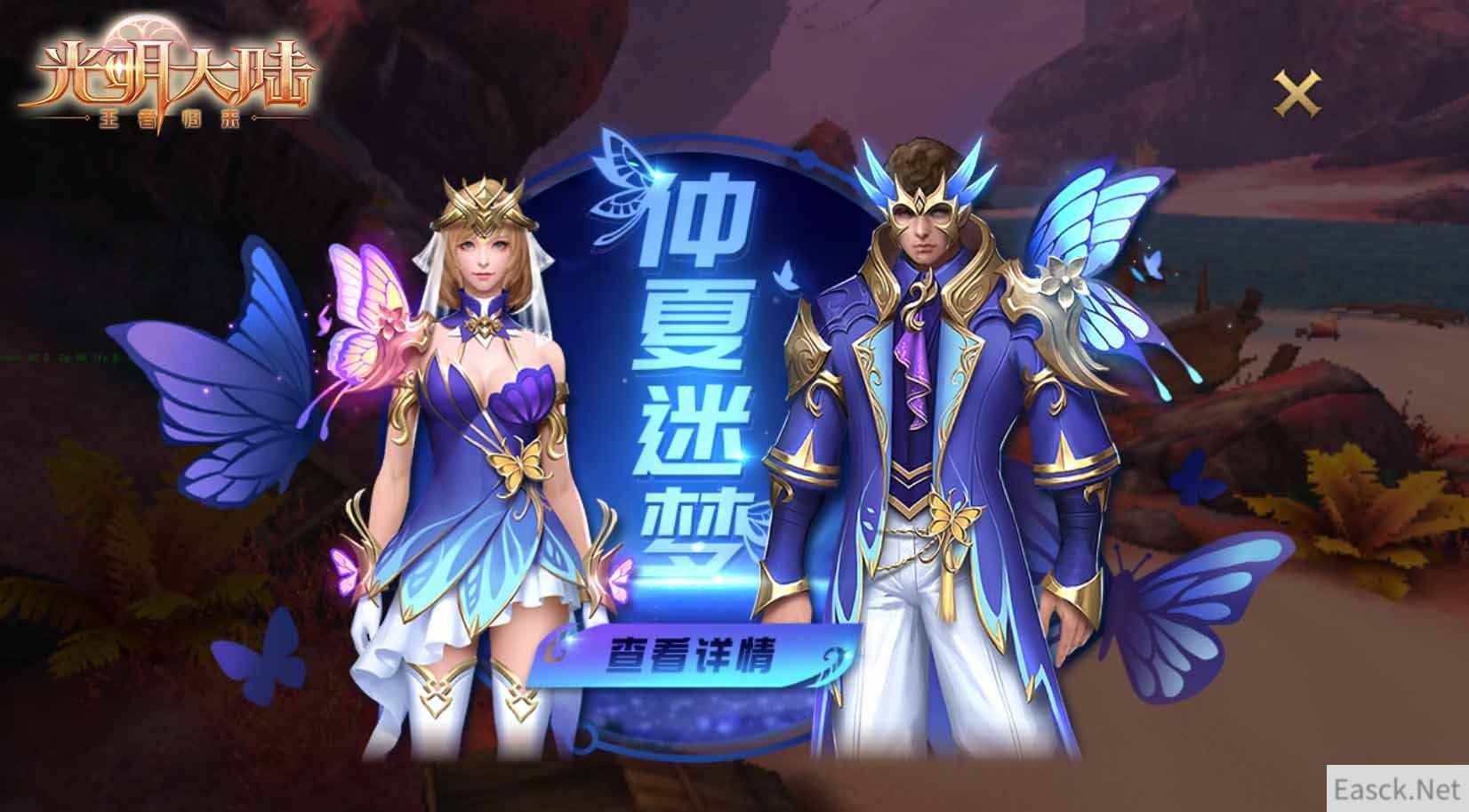 仲夏迷梦时装 蝶舞翩翩梦幻清爽 仲夏时节,有什么事情能比在习习微风中沉入一场凉爽的睡眠更爽快的呢?《光明大陆》本周推出仲夏迷梦时装,淡紫、深蓝、浅蓝、纯白等冷色调配色,让这套时装充满清爽的感觉,让人一消夏日的燥热。女生款,有着透明洁白的头纱,如叶片交织的连衣短裙,肩膀上更点缀着粉红色的蝴蝶装饰,好像迷梦中的蝴蝶为了绽放的花朵停留。男士款式,则是幽蓝的燕尾服搭配着白色丝绸长裤,优雅而顺滑,肩部装饰着蓝色凤尾蝶,带着鳞翅的头冠,很适合去参加一场假面舞会的狂欢。