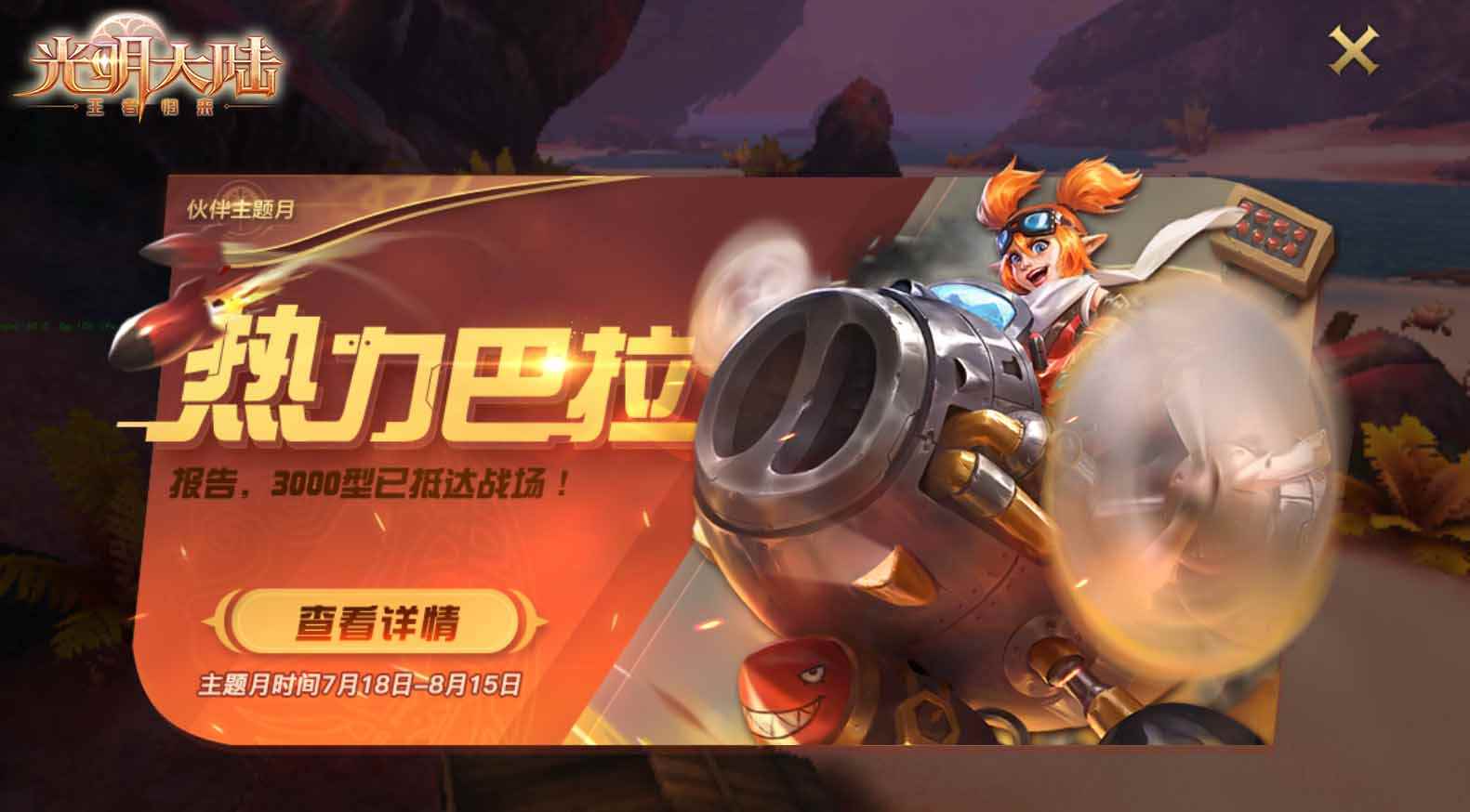 仲夏降临玛瑟兰德,树荫里蝉鸣阵阵,五彩缤纷的花朵在骄阳下盛开,凯伦城热情的夏日祭典也继续狂欢进行中。本周《光明大陆》依旧亮点多多,全新伙伴梵妮驾驶着热力巴拉3000型飞行器闪亮登场,仲夏迷梦蝴蝶时装则将为勇士们再添新装,更有幸运夺宝活动限时开启,惊喜不断! S级伙伴热力巴拉酷炫登场 本周开启的伙伴主题月,将迎来S级伙伴热力巴拉,她是一位强力远程物理输出型伙伴。梵妮因不幸的命运失去了双亲,以及作为地灵族操控元素的能力。而后她被“疯狂科学家”奥维斯比利乌收养,并得到了养父为她量身打造的究极机甲:热力巴拉3000型,强大的战斗导弹飞行器。