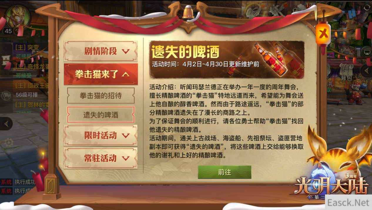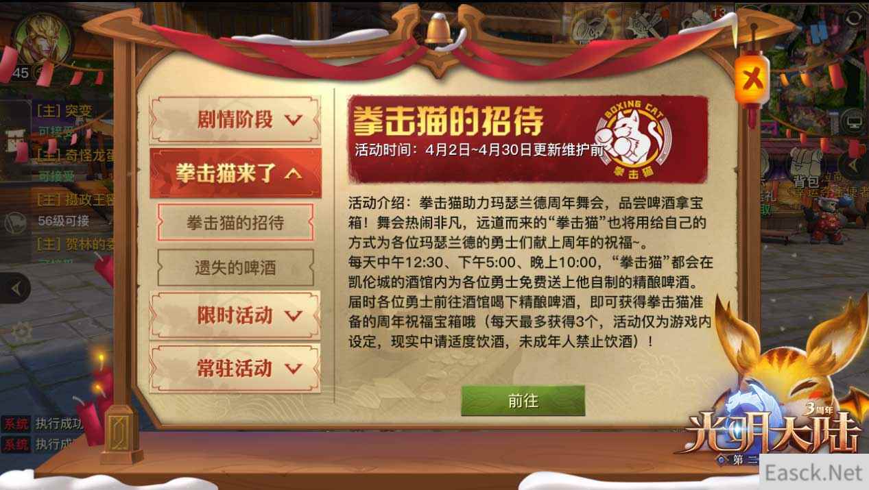 除了打怪收集酒瓶,勇士们在酒吧里喝喝酒也能轻松拿到不错的礼包,4月2日~4月30日每天中午12:30、下午5:00、晚上10:00,前往酒馆喝下拳击猫送上的免费精酿啤酒,就能获得拳击猫周年祝福宝箱(仅为游戏设定,未成年人禁止饮酒,成年人也需注意适度饮酒)。