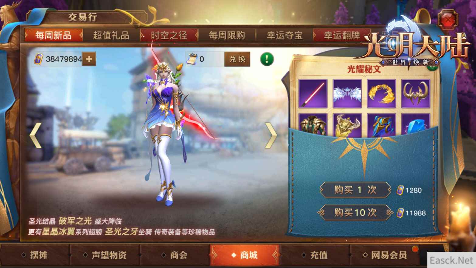 每周新品 破军之光 勇士每次购买“光耀秘文”即可获得1个积分道具,积分可以兑换“破军之光”武器时装等珍稀道具。 |