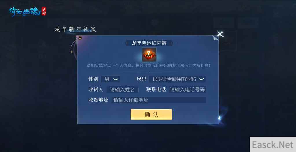 【好运春节不打烊,暖心礼盒派送中】 年少不知红运好,直到爆鬼爆到宝。与去年的洽洽瓜子大礼包不同,为了能让小伙伴们早日穿上暖心红裤衩,春节爆鬼爆不停,今年倩女手游将内卷进行到底——春节期间快递不打烊,持续为您派送这份心选好礼。获得【龙年鸿运红内裤礼盒】的小伙伴记得及时打开道具,填写收货地址,方能早日获得幸运加持哦。