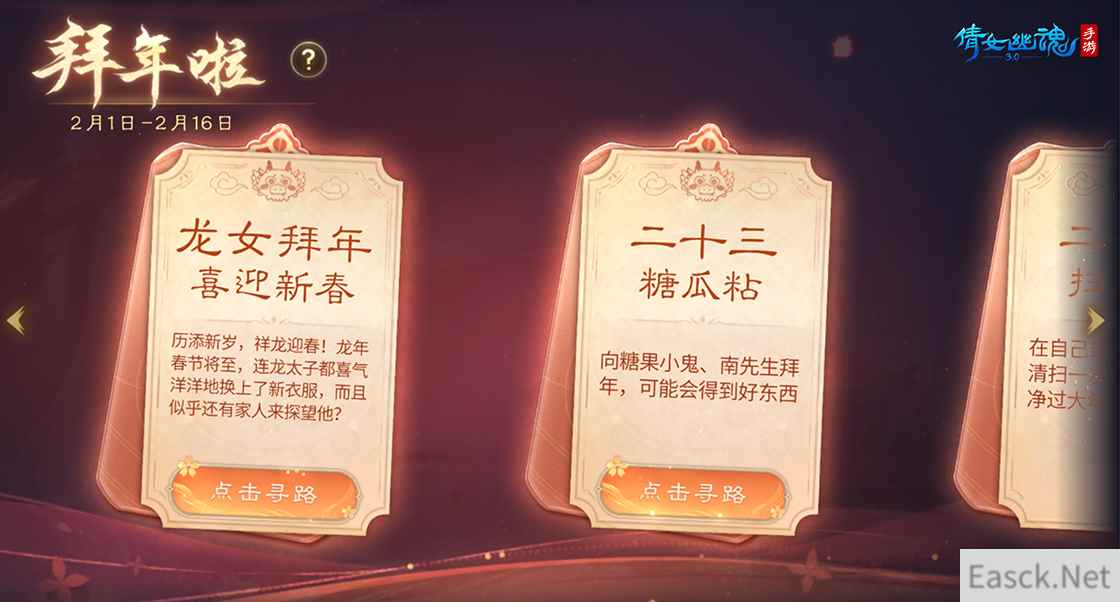 【龙女拜年接好运,红火新春抢先迎】 即日起,接取春节节日活动【拜年啦】,2月1日至2月10日每天都有新任务开启,完成“龙女拜年”系列任务后,有机会获得【龙年鸿运红内裤礼盒】。
