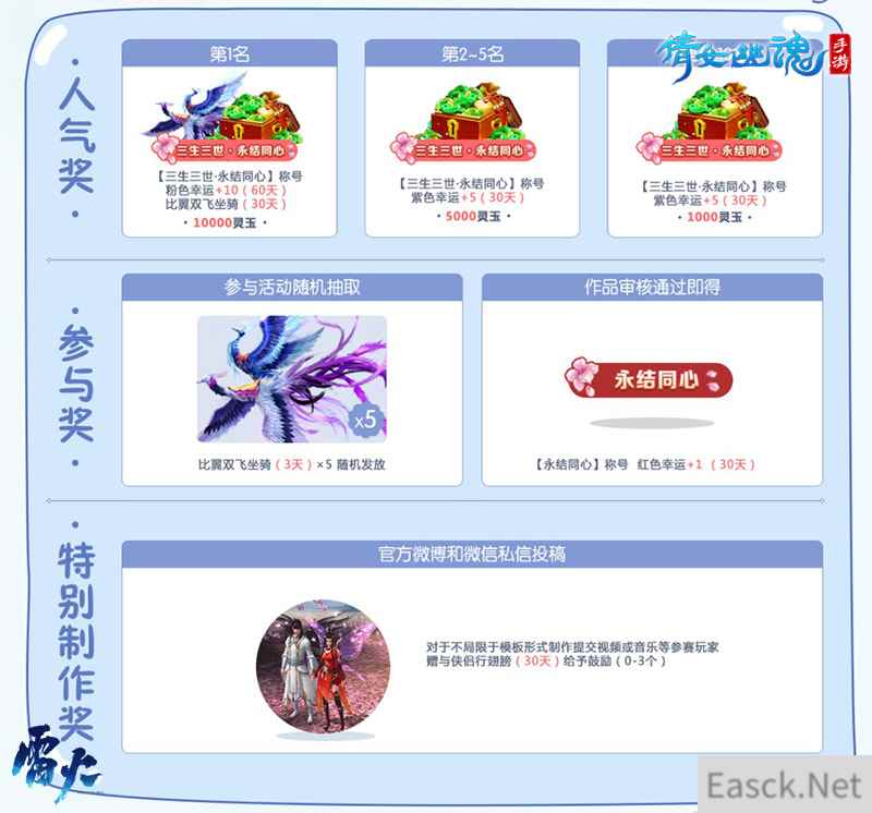 【我有好礼酬君情,缤纷奖励嗨不停!】 对于活动的参赛者,倩女手游准备了丰富多彩的奖励。作品通过审核即可获得【永结同心】称号、红色幸运+1;人气奖获得者,将能够获得【三生三世,永结同心】称号,第一名还有粉色幸运+10、比翼双飞坐骑与10000灵玉相赠!另外,活动还将随机抽取五名幸运玩家,送上永结同心坐骑!另外在官方微信、微博上投稿视频、音乐的参赛者也能够获得侠侣行翅膀作为奖励!