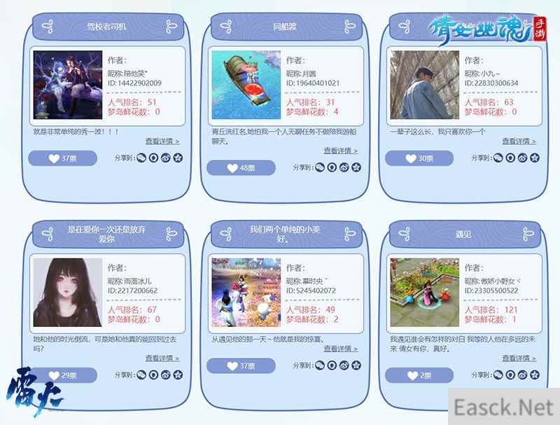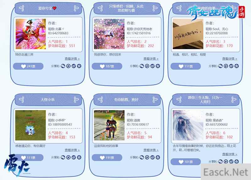 奖励这么丰富,你还在等什么呢? 30级及以上的玩家都可以参加此次活动,以独特创意书写你的爱情故事!作品排名将根据网页投票与梦岛鲜花数决定,快找你的小伙伴为你投票吧! 【倩女佳话传四方,火热活动就等你!】 不仅如此,在投稿页面,玩家不仅可以说出自己的故事,也可以欣赏其他玩家们的故事,感受三界情缘!目前不少玩家积极参与到了“倾诉你的美好”活动中,其中的优秀作品更是层出不穷!各位侠侣们纷纷晒出了自己动人故事!一位叫做【北慕ゞ】的少侠就记录了他与爱人成婚以来的点点滴滴、酸甜苦辣,诉说了自己的爱意;而另一位玩家【迦茵】则以细腻的笔触,用散文的方式写出了与恋人从相遇到相识、于三界之中一同度过春夏秋冬的故事。