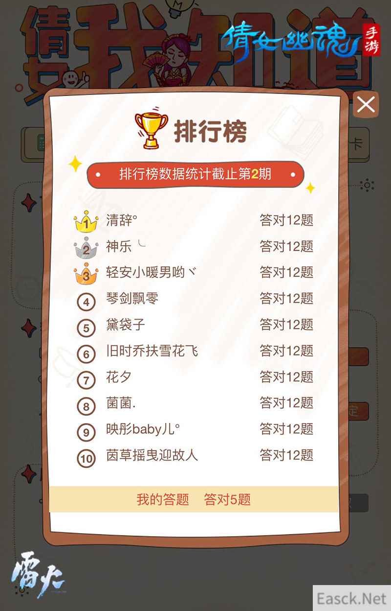 上一期的12道题目大部分和倩女手游最新的玩法或者活动有关系,如纹饰系统和斗地主玩法。玩家们不妨多关注游戏最新的消息,也许就能押对题目呢。另外也有少部分问题与主角剧情相关,这就需要玩家们对20大主角的故事了如指掌。除此之外小编还发现,有些题目需要玩家仔细审题,逐自分析,不然会很容易被误导。