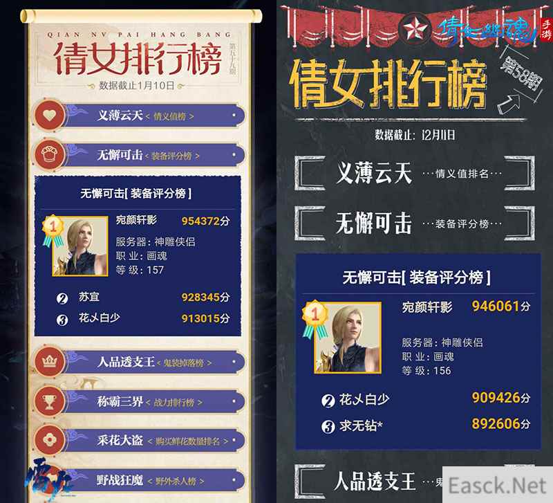 【新年首榜盛大来袭,更多精彩尽在膜拜】 在新年的第一期膜拜榜中,装备评分榜和战力排行榜榜首仍然由来自【神雕侠侣】的玩家【宛颜轩影】所占据,两项评分分别达到了954372和1795609。而来自【庄生梦蝶】服务器的玩家【偶?遇菇】则以196件鬼装掉落成为本期人品透支王。其他更多精彩排行,尽在本期膜拜榜!