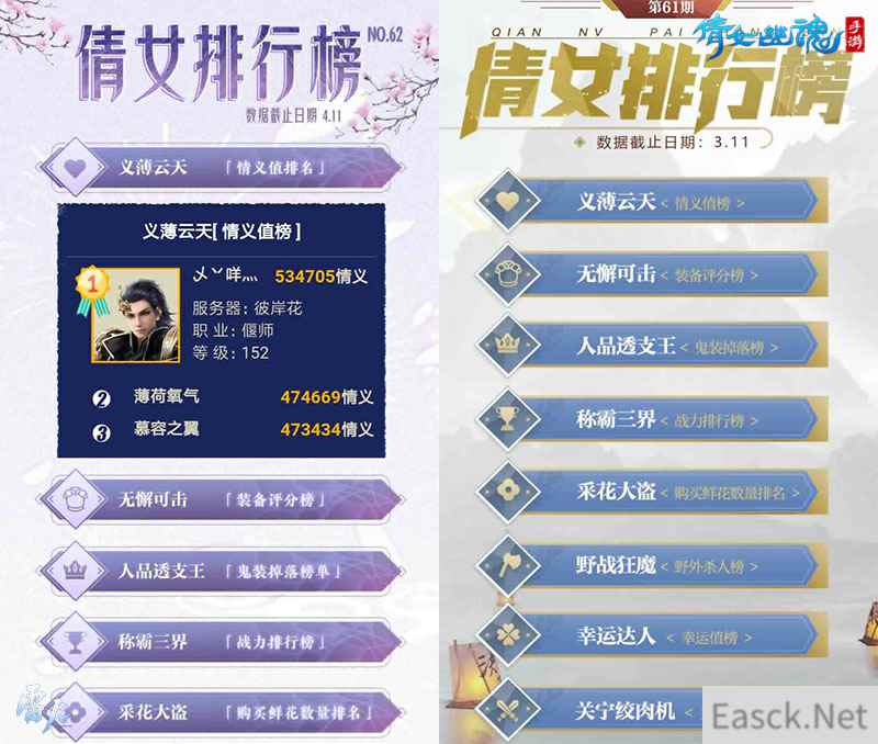【全新榜单盛大来袭,更多精彩尽在膜拜】 在本期膜拜榜中,来自【彼岸花】服务器的玩家【乄丷咩灬】以534705点情义独占义薄云天榜首;来自【雪中情】的玩家【莫离づ涟漪】则以217件鬼装掉落成为本期人品透支王;而幸运值榜首则由来自【巴山夜雨】的【小小究】以654幸运占据。其他更多精彩排行,尽在本期膜拜榜!