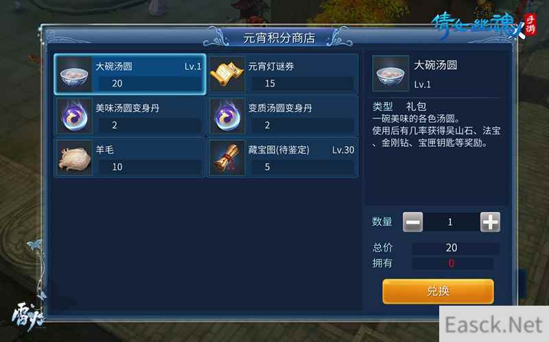 获取的元宵积分可以在元宵积分商店兑换物品,其中包括有几率开出吴山石、金刚钻、法宝等道具的大碗汤圆礼包;可以参加灯谜的元宵灯谜卷;神奇的汤圆变身丹;以及羊毛和藏宝图。