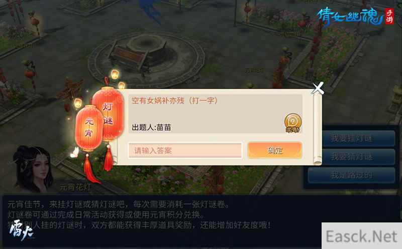 【猜谜解字赢取奖励,喜迎元宵天降宝箱】 元宵活动期间帮会中还有有趣的猜灯谜活动,玩家参加缤纷汤圆和日常任务有几率获得元宵灯谜卷,而后即可前往帮会城市使用悬挂灯谜或猜灯谜。答对灯谜的玩家将会获得元宵字谜花灯奖励,使用则有机会获得金刚钻、宝匣钥匙等珍稀道具。同时活动期间部分场景还有天降宝箱福利,千万不要错过哦!