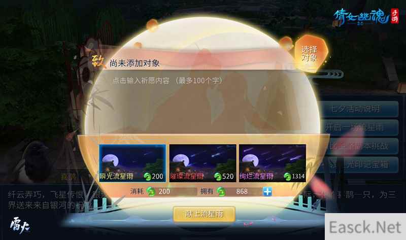 【郎情妾意鹊桥会,七夕玩法将来袭】 相爱不易,情比金坚。七夕活动期间玩家可以挑战全新副本玩法。副本中玩家将从不同位置出生,跨越各种阻碍,最终相会并合力战胜BOSS。此外,玩家还可以在NPC喜鹊处祈愿,为自己心中的ta献上一场盛大的流星雨。