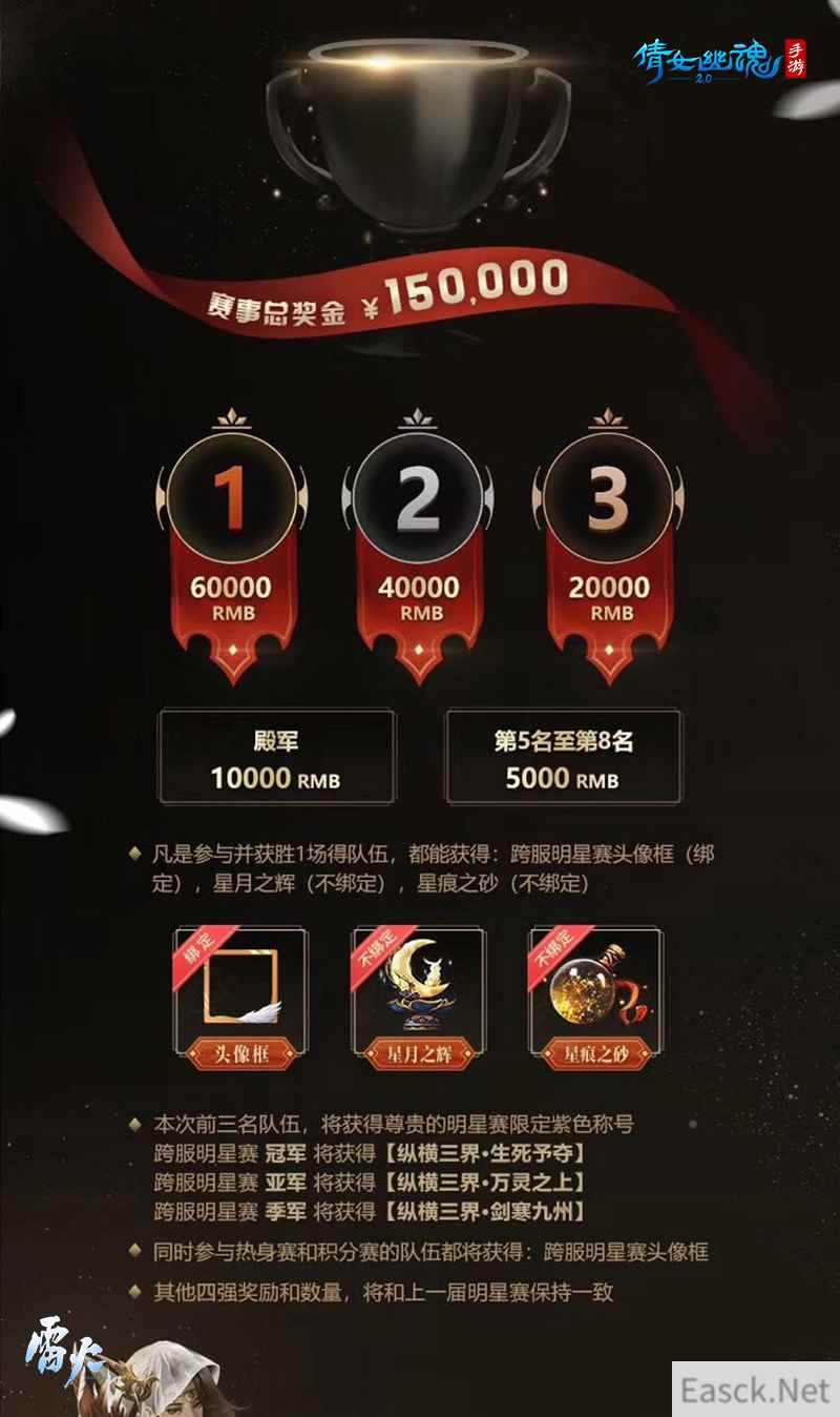(每天都可以参与竞猜获取海量银两) 【风起云涌争夺冠军宝座,十五万元大奖花落谁家】 倩女手游跨服明星赛暨决赛将在本周末开打!八强将以单败赛制决出最终四强,而四强赛将以冲突更激烈的双败赛制决出本次跨服明星赛的总冠军!最终八强分得总奖金足有十五万元。各路豪强只需突破小组赛,打入八强便可获得奖励,三甲可获得专属称号,而冠军更有专属翅膀与冠军雕像奖励!