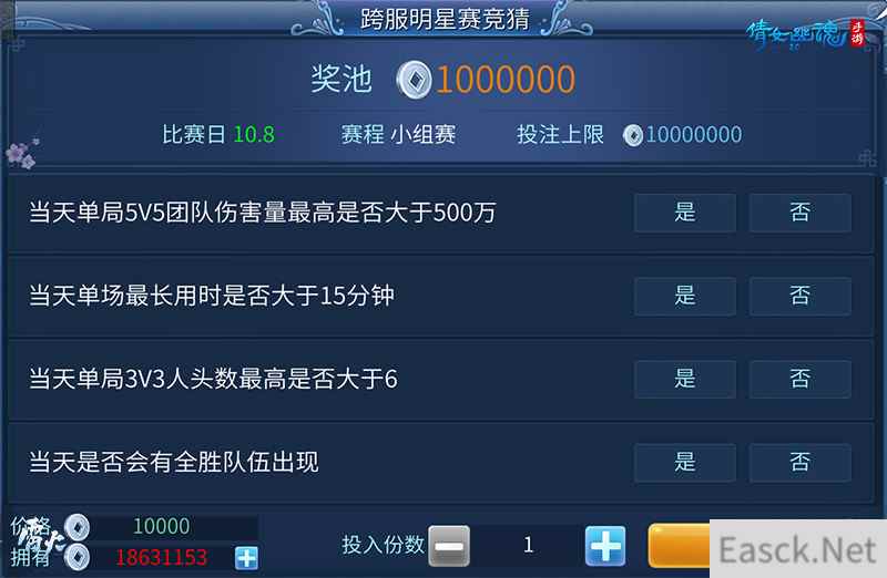(恭喜随心所欲战队晋级八强) 在昨天乙组比赛中,经过一番龙争虎斗,【风云天下】战队力挫群雄,脱颖而出,以小组头名获得了八强门票!而【风云雄霸天下】战队亦表现出色,以小组第二晋级八强! 丙组与丁组的战斗将会在今明两日晚19点正式打响!究竟哪些队伍能跻身淘汰赛呢?让我们一起在CC17频道拭目以待。 【刺激战局带来视觉盛宴,观赛竞猜赚取海量银两】 本次跨服明星赛依旧可在CC17频道观看全程比赛,赛程已进入正赛,跨服明星赛精彩活动正式开启!三界玩家们在观赛之余,可以在游戏内投注,只需在活动页面进入跨服明星赛竞猜活动,选择相应项目,按自己心中所想投入银两,待到每日比赛结束就有机会获得海量银两奖励!