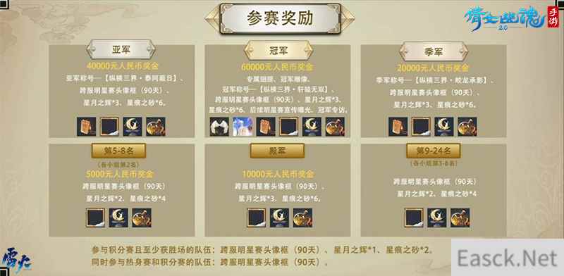 (3v3上演巅峰对决) 【丰厚奖励归属冠军队伍,见证赛事传奇领海量福利】 倩女手游第四届跨服明星赛四强总决赛于3月1日22:00时落下帷幕,四强队伍共同角逐15万元现金奖励!冠军队伍【醉酒当歌】将获得6万元人民币奖金、【纵横三界·轩辕无双】专属称号、跨服明星赛雕像等珍贵奖品,专属翅膀【鹤雪明光翼】乘风跨海而来,还有冠军专访与后续明星赛宣传曝光奖励!同时亚军队伍【神雕侠侣】、季军队伍【立夏后宫团】和殿军队伍【虎虎虎】也分别获得4万元、2万元、1万元现金大奖与其他丰厚奖励!参与竞猜投注与直播互动的玩家,将获得海量银两和周边好礼!