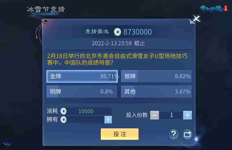 参与活动的玩家还可以查看自己的下注情况并分享活动。如今,2022北京冬奥会正如火如荼展开,在为健儿们欢欣鼓舞的同时,游戏内的精彩活动亦是不容错过。快来参与投注分享胜利喜悦,看看谁才是真正的欧皇吧!