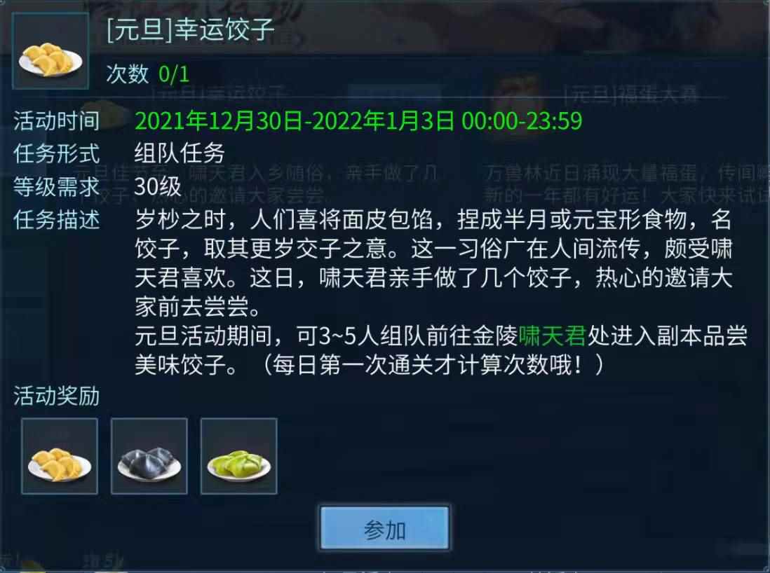 【新年吃饺子迎好运,宝库之门开启天降宝箱】 新年新气象,好运等你来!元旦活动期间,玩家还可以3-5人组队参与幸运饺子副本玩法。副本中有三种能够带来不同“福利”的不同饺子,完成副本挑战后即可获得银票、经验、活跃度等奖励。