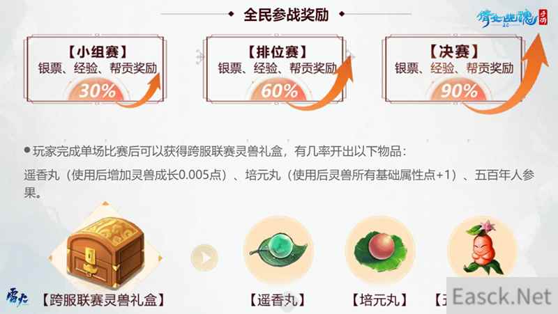 本次联赛主副战场的迭代将会对赛事产生重要影响。战场将新增【联赛神坛】,帮众可以领取攻击或者防御增益。此外,主战场人数限制提升至40人,排兵布阵时将带来全新体验。同时,副战场将新增小神兽,击杀后可为主副战场提供攻击增益次数。每个大区获得冠亚季军的帮会将获得专属帮会装饰物,前8名服务器的帮会成员将获得专属称号,所有参与跨服联赛的帮会成员都将获得获得大量银票、经验及帮贡奖励。