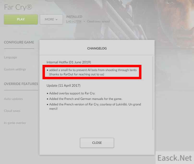 FarOut即这个修复补丁的作者,他也单独在ModDB上发布过该补丁,在最新的帖子中,他对官方的更新也表示赞赏。“虽然不少粉丝自创补丁都能解决问题,但是这似乎是第一次卖家自己推送如此老游戏的修复版本,为GOG点赞!” |