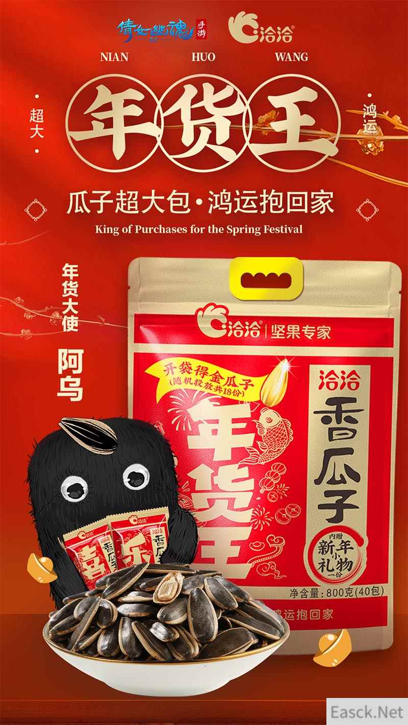 【倩女幽魂手游x洽洽食品,年味共享快乐加倍】 倩女幽魂手游联动【洽洽食品】,逢此新春之际为小伙伴们带来新春联动限量瓜子礼包,带你复“嗑”记忆中的精彩年味!春节期间,将有6666份【洽洽瓜子鸿运礼包】在游戏内限时掉落!玩家上线参与春节节日活动,即有机会被超大份瓜子礼包砸中。每份瓜子礼包共含800g熟制葵瓜子,整整40包独立包装的洽洽瓜子抱回家!新年交好运,年味“嗑”出来!