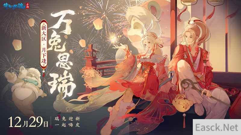 【预约新服豪礼相送,新大区首服即将开启】 全新大区【月下逢】首服【万兔思瑞】将于12月29日开启!12月19日至12月29日,玩家们可以前往预约页面抱团预约新服,领定制称号【奈斯兔蜜特油】!开服七天连续登陆,每天抽取幸运儿赠送风呢喃坐骑、浮世清辉时装盲盒(衣+冠)、瑞兔呈祥新年礼盒等豪礼!三界之中还有更多惊喜等你前来探索!快呼朋唤友一同预约新服吧~