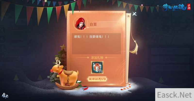 与此同时,帮会将出现飘雪的圣诞树,帮会成员可在树下祈愿,亦可挂上美好心意,互赠圣诞华礼、圣诞星礼。挂起灵玉礼物数量排名前20的帮主、副帮主、长老每晚22:00还可在圣诞树处开启专属活动,圣诞老人及神鹿使将携好礼降临部分帮会,帮会成员可前往拾取,共同欢庆圣诞,被选为神鹿使的玩家也将获得【瑞鹿哟哟·片影】。