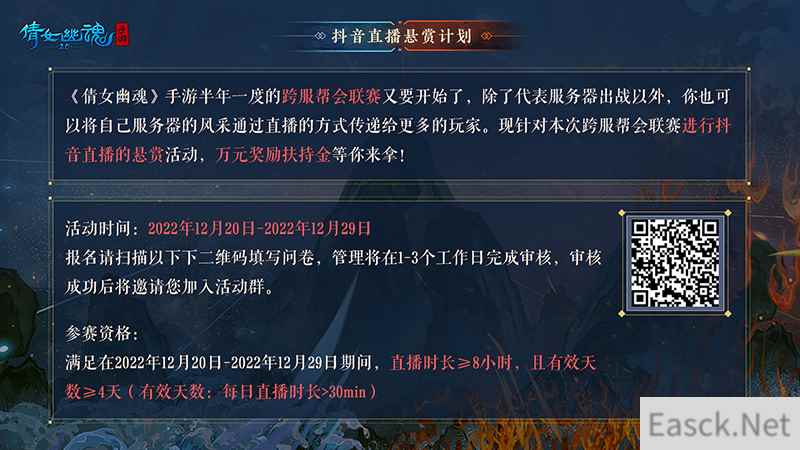 【抖音直播全民招募,万元奖励等你赢取】 随着第三届跨服帮会联赛正式开赛,倩女手游也在抖音平台开启了全民直播的招募征集活动!除了代表服务器出战外,参赛的小伙伴们也可以将自己服务器的风采,通过直播的方式传递给更多的玩家。活动时间为2022年12月20日-2022年12月29日,玩家可扫描以下二维码参与活动,万元扶持金奖励等你来拿!