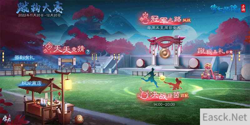 倩女手游四年一度的蹴鞠大赛11月20日-12月20日激燃回归!多人匹配【决战绿茵】,一决高下谁与争锋;五人组队挑战【冠军之路】,击败黑门神,夺冠军奖杯!活动期间更有蹴鞠嘉礼等你赢取,累计签到获得【蒲公英拓本】礼包,积分兑换经典颠球动作!小伙伴们快在绿茵场上大展身手吧!