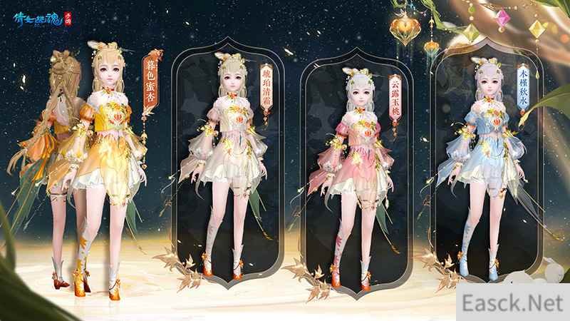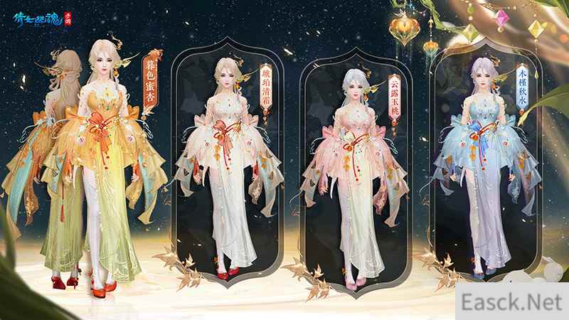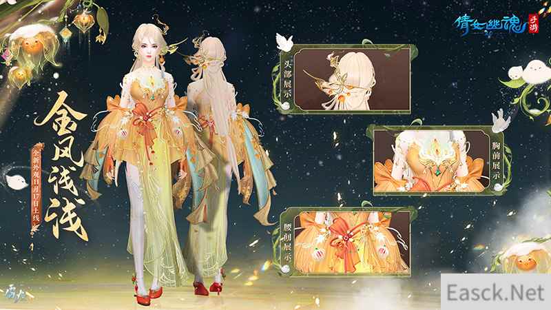 【全新时装即将上线,霞姿月韵温婉嫣然】 全新时装【金凤浅浅】伴随着梦幻的灯笼果坐骑【秋霜如蜜】随风降临!舞姿翩迁,漫天枫叶落满身,这一抹金黄似是晚秋的赠礼,亦是【金风浅浅】衣衫上的灵巧点缀。本次时装将以礼盒的形式出售,共有【暮色蜜杏】、【琥珀清霜】、【云露玉桃】、【木槿秋水】四款颜色,四色搭配各有韵味。秋韵浓,霜如蜜,灯笼果寓意吉祥,玩家们出游三界时记得乘上【秋霜如蜜】,将这份秋意珍藏心间。 女款【金风浅浅】时装以缎面材质作为主体,裙摆与臂弯处的蝴蝶结采用了流纱设计。腰间系有深杏色的蝴蝶结丝绸,与鎏金和纯银饰品搭配得相得益彰。同时也有4款异色时装,【琥珀清霜】以奶白和淡雅的琥珀色为主,清雅绝尘;【云露玉桃】采用粉白渐变,更显娇媚柔和;【木槿秋水】以多种蓝色系渐变为主色调,宛若清冽晶莹秀澈。