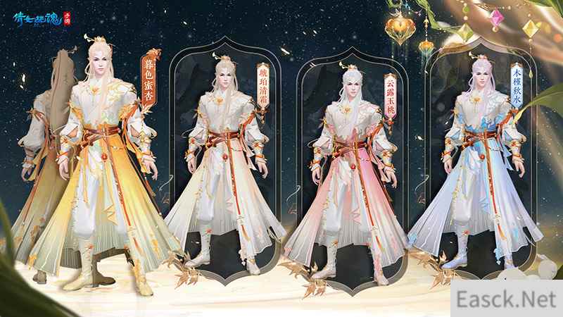 【男款时装潇洒清秀,异色搭配超尘出俗】 男款【金风浅浅】时装以落叶和流苏元素点缀。【暮色蜜杏】款以白色内衬搭配渐变的杏色流纱外袍,细款皮质系带衬出少年身姿。几簇绿叶红果饰品装饰衣衫与长靴,秋韵十足。异色男款时装同样气宇非凡,【琥珀清霜】配色更显绝尘,逸态横生;【云露玉桃】则增添了几分温润气质;【木槿秋水】如同翩翩少年,恣意潇洒。