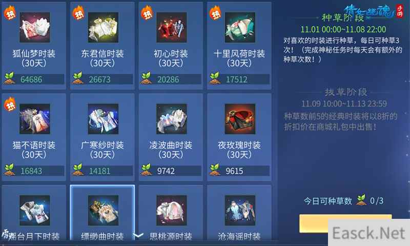 【经典时装限时返场,种草投票折扣出售】 11月1日-11月8日,全服开启经典时装种草投票!每位玩家每日有3次种草投票机会,完成神秘任务时每天会有额外的种草次数!截至11月8日22时,种草数前5名的时装将于11月9日10:00-11月13日以8折的折扣价在商城礼包中返场出售! 十五款时装重返三界舞台!经典浪漫的【夜玫瑰】、【东君信】、【初心】、【飘渺曲】、【缘梦】;元气可爱的【狐仙梦】、【猫不语】;融合了花朵元素的【思桃源】、【笑春风】、【花摇灯影】、【十里风荷】以及仙气飘然的【瑶台月下】、【沧海谣】、【凌波曲】、【广寒纱】尽数包含其中,等待大家的投票!玩家们快pick自己心动的时装,为它投上宝贵的一票吧~