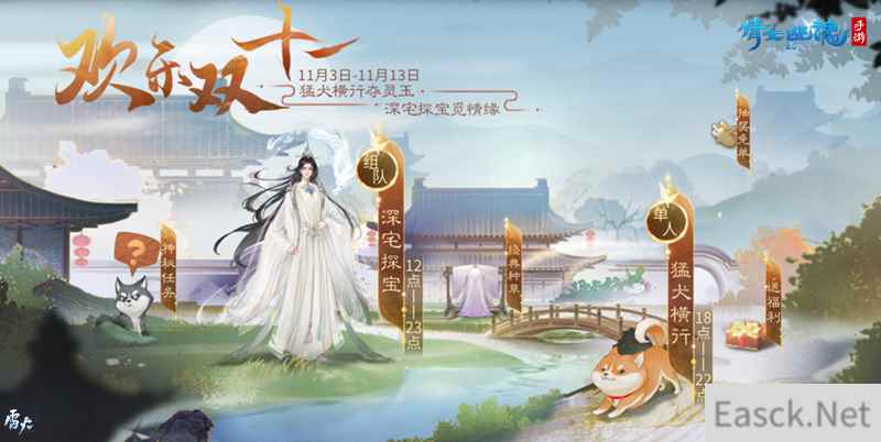 【猛犬冲撞巧夺宝箱,深宅组队探寻珍宝】 欢乐双十一活动期间18:00-22:00,【猛犬横行】玩法开放,等级≥50级即可单人参与!躲避横冲直撞的猛犬,巧夺暗藏着富饶的灵玉宝箱!四名玩家相竞夺取灵玉宝箱,在单局玩法3分钟内,开启最多宝箱并返回出生地的玩家将赢得胜利,获得丰厚奖励!
