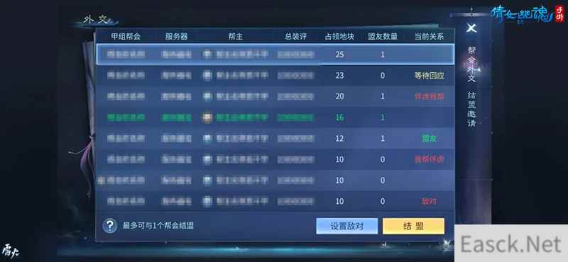 本次赛事还将新增敌对关系,通过帮会城市许海宴处理外交关系(同盟关系或敌对关系),结盟、设置敌对数量均至多一个,开战期间不可结盟,其余时间均可结盟;同一组排名前二的帮会不可结盟。此外,本赛季的场景也进行了优化,给玩家们带来更真实的对弈体验,快来参与本届【天地棋局】感受热血战斗氛围!