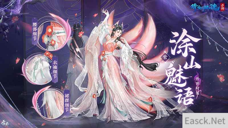 【灵狐幻化吉凶难辨,青丘邂逅共话传说】 本次时装灵感来源于《山海经》,《山海经·南山经》记载 :“青丘之山有兽焉,其状如狐而九尾。”传闻其为王道天命之证,现身之处海晏河清。但亦是欲念贪妄之渊,媚骨天成,祸乱苍生。究竟是祥瑞还是妖祟?人们不得而知。上古大妖九尾狐魂魄所化,披此衣冠者,可召唤涂山灵狐。首款祥瑞系列传世时装【涂山魅语】,9月25日与诸位邂逅,共话九尾狐的传说。