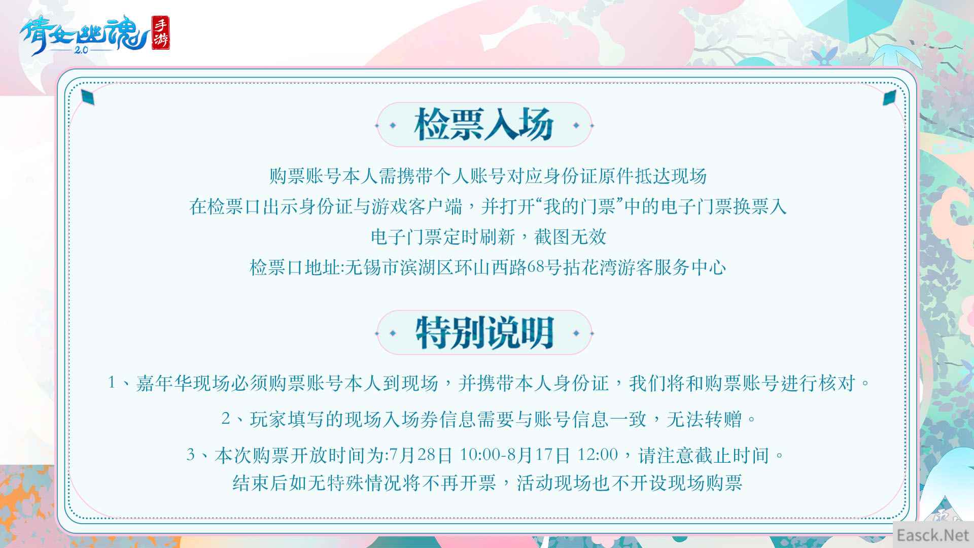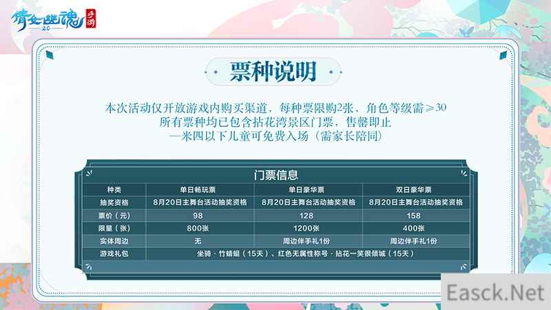 【拈花一笑与君归,购票福利畅玩来袭】 2023倩女幽魂嘉年华门票7月28日10:00起限量开售,全新周边、全服唯一永久坐骑,就在现场向你招手!此次活动门票不仅包含拈花湾景区门票,更有殷紫萍花朵抱枕、天堂伞联名晴雨伞、超大刀魅CP鼠标垫等多款新品周边首次亮相,物超所值!玩家可登录《倩女幽魂》手游,前往【福利】界面-【嘉年华门票】购票。全服唯一永久坐骑8月20日等你前往现场抽取!
