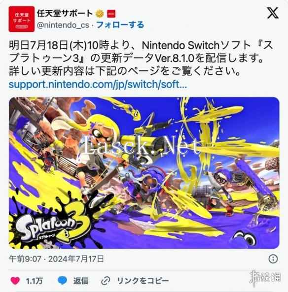 任天堂于2024年7月17日宣布,Nintendo Switch游戏《喷射战士3》将于7月18日上午10:00发布Ver. 8.1.0更新。 本次更新带来多项玩家操作的改进和武器性能调整,尤其针对主要武器和特殊武器。