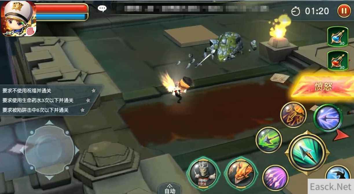战败者殿堂三层 战败者殿堂三层的必要任务是限制时间内消灭并到达指定地点。总共只有一个怪物区域,没有BOSS或者说这关的BOSS是地形。4x4的区域中有五块陷阱,再加上刷怪,变相的限制了移动范围。三星要求有三个,异常状态4次以下,生命值40%以上和躺下2次以下。因为不限制用药,所以生命值一条可以忽视,要注意的异常状态和躺下其实就是要求尽量不要被击中和不要踩陷阱。好在刷怪数量不多频率不高,那么用好范围技能和召唤兽清场就好。满星通关要点就是:不要随意走位、用好范围技能限制技能和召唤兽。