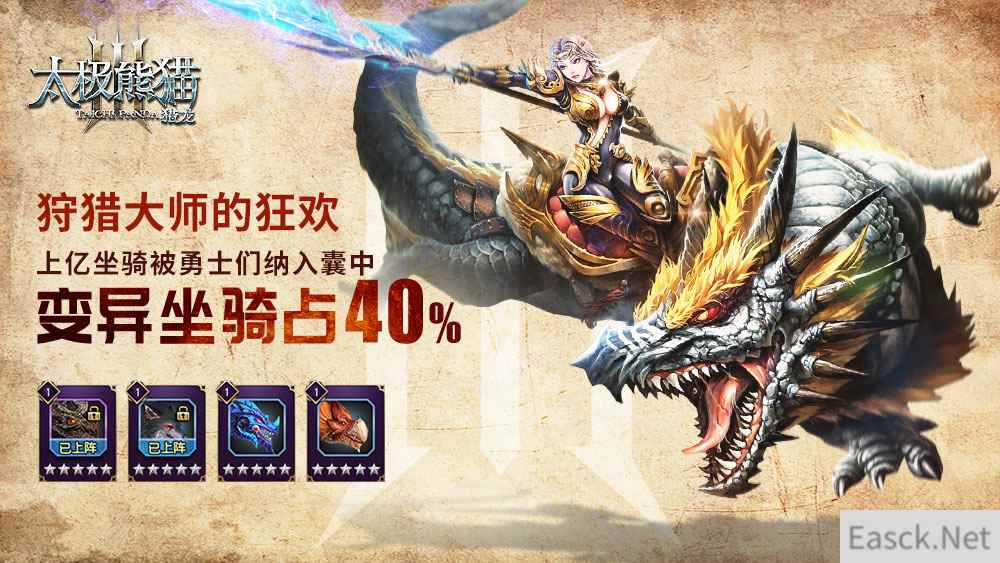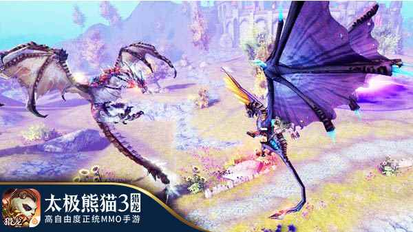 【狩猎狂欢,千万神兽尽入囊中!】 《太极熊猫3:猎龙》独创的猎龙玩法使玩家可以在野外自由狩猎遭遇的凶猛生物,甚至征服强大的世界BOSS,与之一同战斗,在开阔的大世界中开展冒险。玩家的战斗策略和操作不再局限于固定的套路,多样化的坐骑系统支持下,颠覆传统MMO手游的战斗模式由此而生! 资料片上线以来,伊瓦兰斯的狩猎大师们已经在这个奇幻世界中征服了上亿强大的珍奇异兽,其中出现变异坐骑的概率达到了40%!强大的坐骑伙伴现在也在不断出现在冒险者们的视野之中,赶快骑上你的巨龙,加入到这场狩猎狂欢中去吧!
