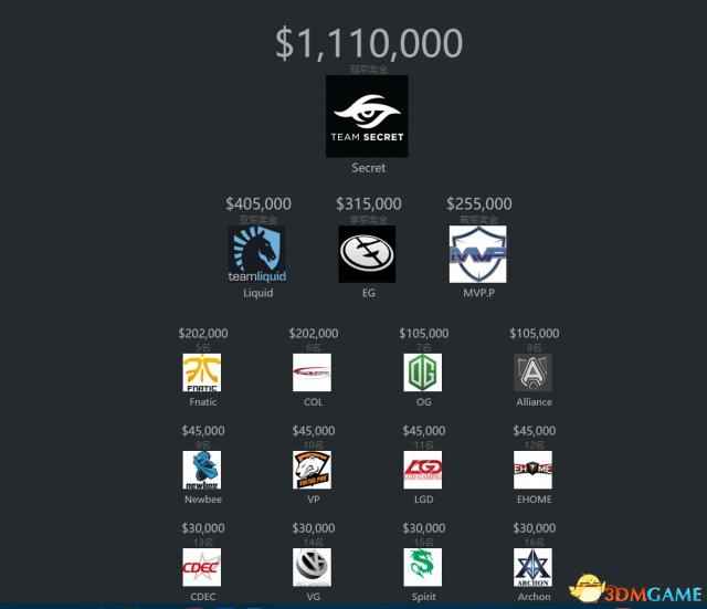 赛事奖金分配,冠军秘密豪夺111万美金,亚军液体和季军EG分夺40.5万和31.5万美金。中国队伍最好的是NB,位列第9名,获得4.5万美金。国内其他队伍排名:LGD(第十一名),Ehome(第十二名),CDEC(第十三名)和VG(第十四名)。