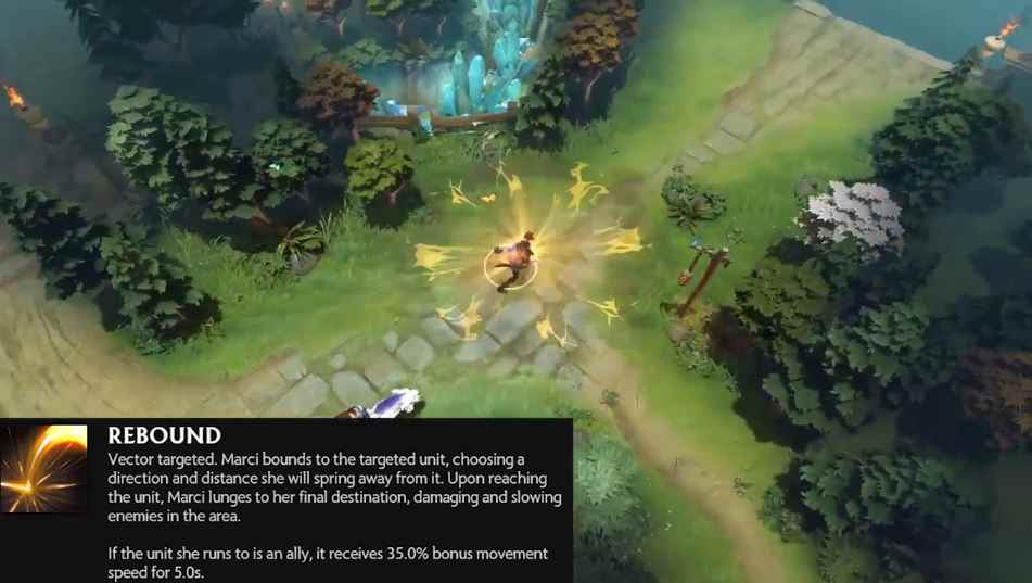 玛西跃向目标单位,选好她要弹开的方向和距离。到达目标后玛西冲向最终的目的地,对区域内敌人造成伤害和减速。