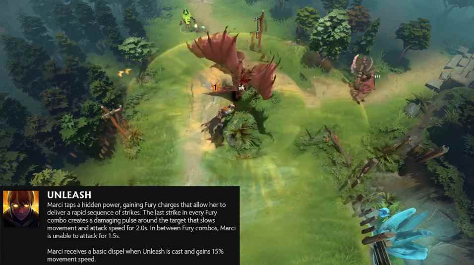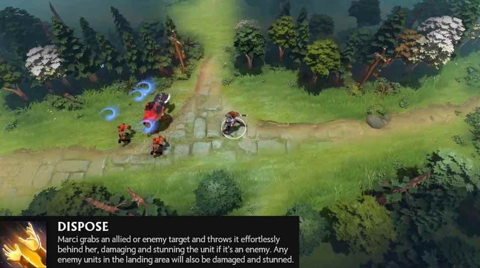 玛西抓起一个友方或敌方目标,并向她身后摔去,敌方目标将受到伤害并被眩晕。落地区域内所有敌方单位也会受到伤害并被眩晕。