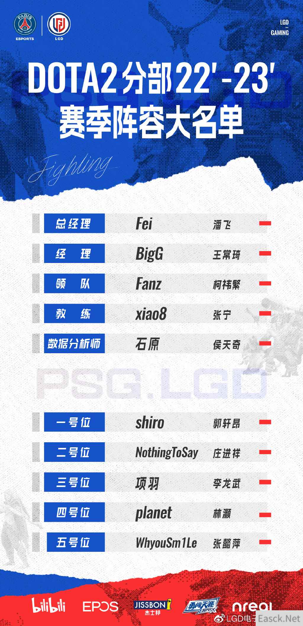 公告如下: 在遵循选手的本人意愿,尊重选手个人发展需要的前提下,经多方友好协商,及内部充分沟通后宣布,LGD电子竞技俱乐部DOTA2 分部做出以下调整: 1.一号位选手王淳煜(ID:萧瑟)转非活跃状态,暂离休息。 2.原EHOME战队一号位选手郭轩昂(ID:shiro)以转会形式正式加入PSG.LGD战队。 3.原EHOME战队四号位选手林灏(ID:planet)以转会形式正式加入PSG.LGD战队。 4.原CDEC战队三号位选手(ID:项羽)上调至PSG.LGD战队。 调整后的PSG.LGD战队成员名单如下: 总经理:潘飞(Fei) 经理:王常琦(BigG) 领队:柯祎繁(Fanz) 教练:张宁(xiao8) 数据分析师:侯天奇(石原) 一号位:郭轩昂(ID:shiro) 二号位:庄进祥(ID:NothingToSay) 三号位:李龙武(ID:项羽) 四号位:林灏(ID:planet) 五号位:张懿萍(ID:WhyouSm1Le) shiro选手性格内敛,打法稳健。作为01年的小将,愿他常记此刻少年心气,乘风破浪。 而planet选手性格强势、打法凶狠又不失细腻。作为团队大脑型选手,他一定能让队伍摩擦出新的火花,让我们拭目以待。 项羽作为CDEC的三号位,在职业道路伊始便崭露头角,在2022DPC第三赛季冲进S级。他的天赋和进步我们有目共睹,未来可期。 相信新鲜血液的加入会为队伍带来更多可能性,PSG.LGD即将开启新的挑战。新的征程,新的起点,让我们一同前行! 除了LGD外,欧洲老牌强队OG也宣布重磅消息——成立OG二队Old G,成员包括: N0tail Topson No[o]ne MSS
