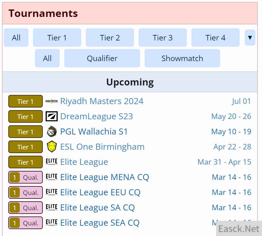 继ESL吉隆坡站、俄罗斯客山未来运动会、BB迪拜别墅杯、ESL梦幻联赛S22后,接下来的就是ESL举办的精英联赛(3.31-4.15,和梦幻联赛S22一样为线上赛,总奖金96万美元),ESL One英国伯明翰站(4.22-4.28)以及PGL瓦拉几亚S1(5.10-5.19)和ESL梦幻联赛S23(5.20-5.26)。这一切都是为了今年6月1日举办的利雅得大师赛,据说总奖金将非常高。