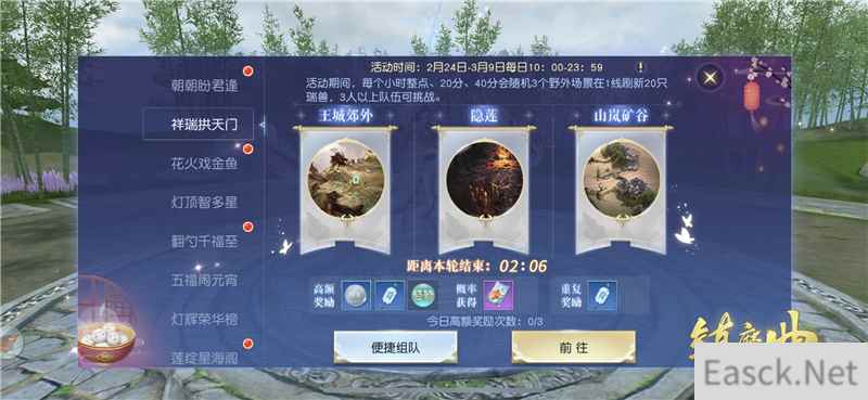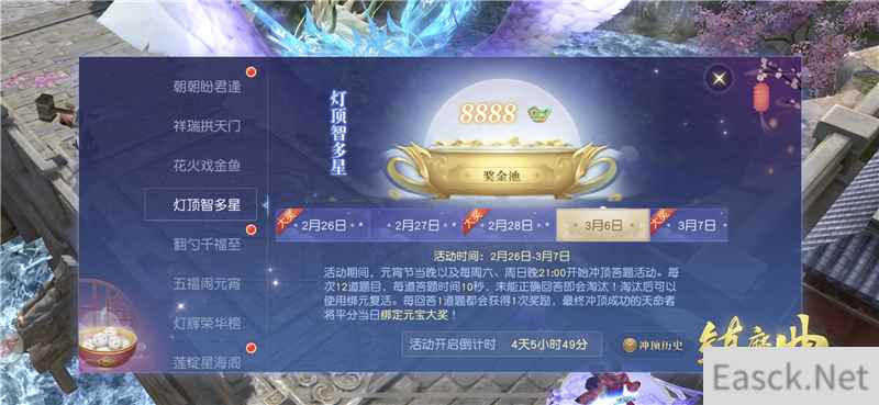 瑞兽闹新春,一起挑战它们吧 本周末(3月6日、3月7日),元宵灯会“灯顶智多星”也将再度开启,天命者们只要参与其中、凭借自己的聪明才智答题闯关,就能平分当天的奖金、赢取海量绑定元宝!